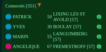 A Gauche : Vous voyez tous les connectés ; Vous pouvez filtrer par age et département en cliquant sur le petit entonnoir. Pour démarrer une conversation avec quelqu'un, cliquez sur la bulle à droite |